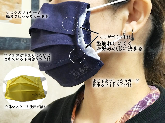 ■お持ちのマスクを入れるだけで洗い替えをうまく活用して頂ければ、マスクの消費が1/3〜1/4に減らす事が出来ます。立体マスクにもご利用頂けます。少しでも医療関係にマスクが行き渡るよう考えました。生地は呉服では古くから用いられる新モス平織で通気性が良く、口元の保湿も保って、もち ろん洗濯ができ、いつでも清潔にご使用していただけます。(ネット洗いをお勧めいたします。)